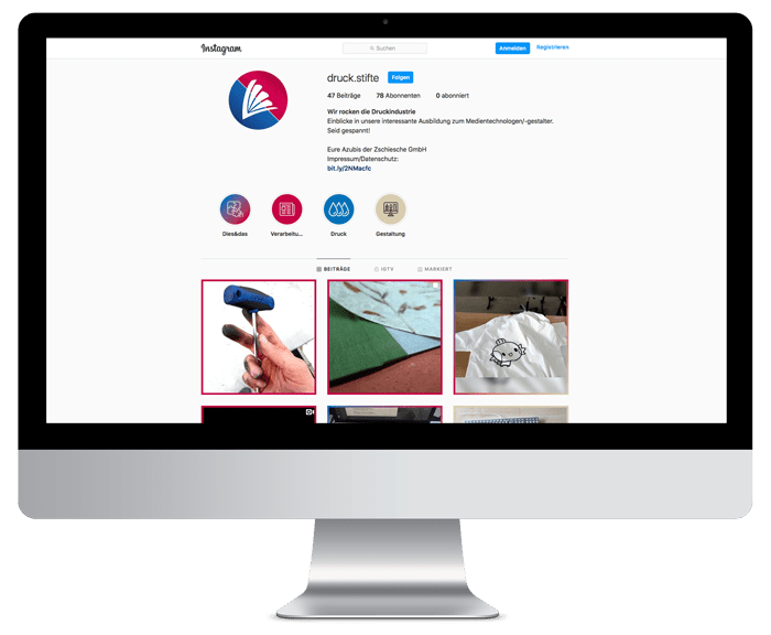 Anfang 2020 starteten unsere Auszubildenden mit dem Projekt „Instagram“. Die Azubis aus allen Abteilungen treffen sich in regelmäßigen Meetings. Ziel ist es, das Interesse für die Berufe Medientechnologe Druck und Druckweiterverarbeitung zu wecken. Mit neuen Azubis soll die Zukunft der Druckindustrie gesichert werden. Auf ihrem Instagram-Account werden mit mehreren Posts pro Woche die Berufe und deren Aufgaben auf eine interessante Art und Weise vorgestellt.